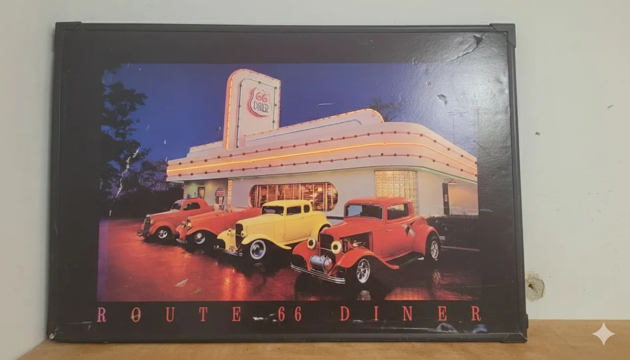 Lindos quadros decorativos com a icônica Route 66 Diner, perfeito para decorar seu espaço com um toque retrô e cheio de estilo. Peças únicas para os amantes de carros e da cultura americana!