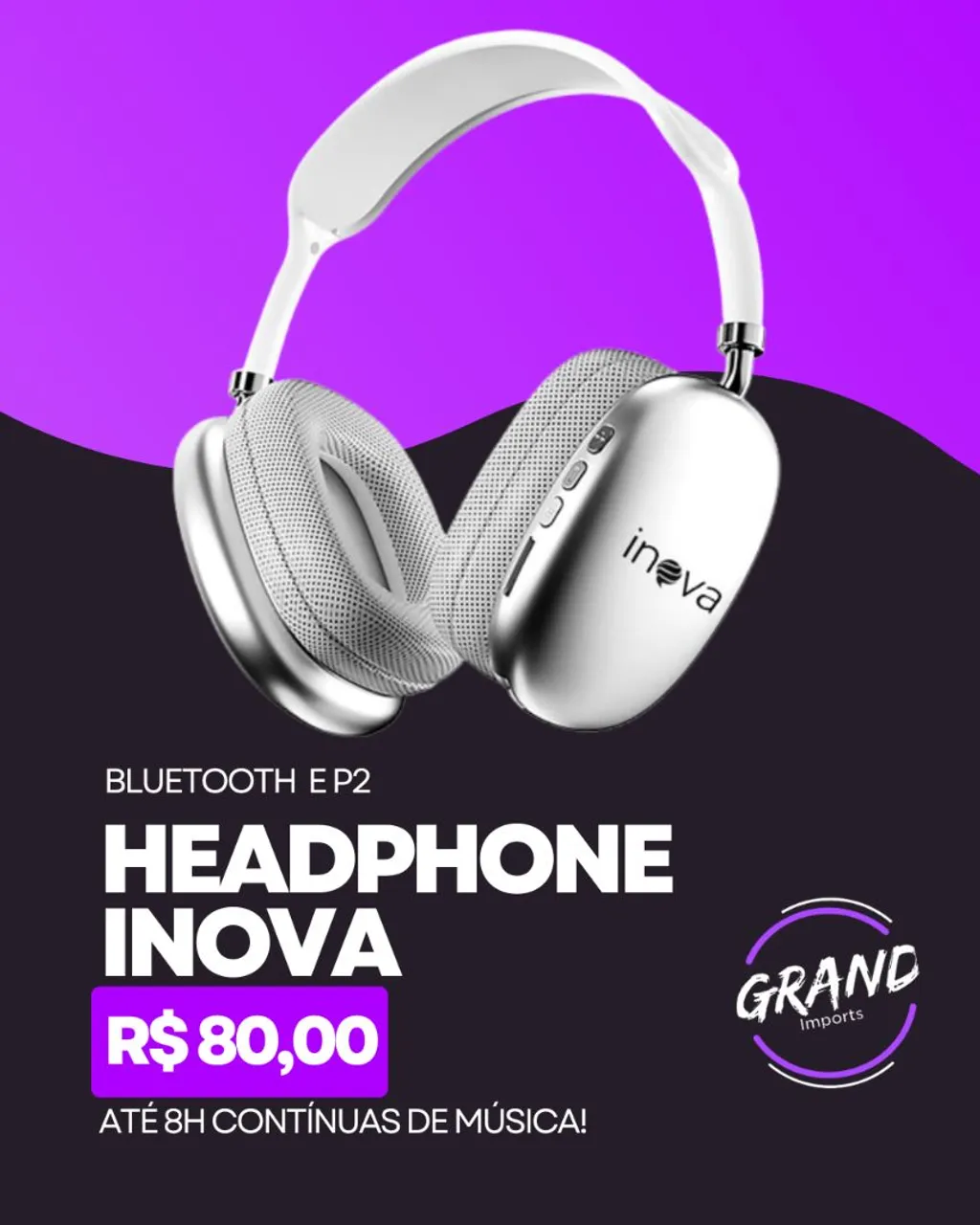 Desfrute de até 8 horas de música contínua com o Headphone Inova Bluetooth. Som de alta qualidade e design moderno para você!