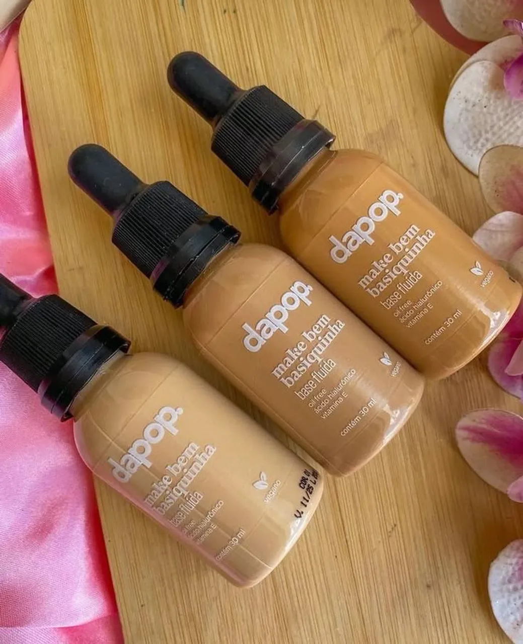 Base Fluida Make Bem Basiquinha da Dapop, oil free, com ácido hialurônico e vitamina E. Perfeita para uma pele radiante e com acabamento impecável!