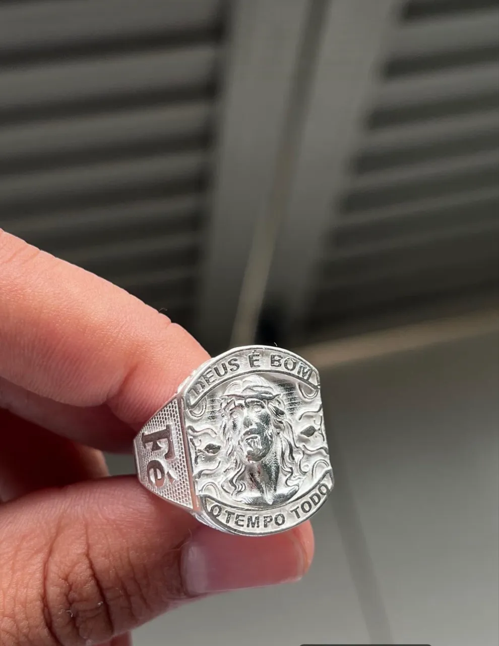 Lindo anel de prata com detalhes religiosos. Uma joia que combina fé e estilo, perfeita para expressar sua devoção com elegância.