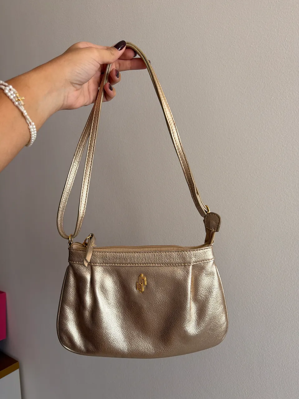 Bolsa em couro, dourada e com alça ajustável, perfeita para qualquer ocasião.
