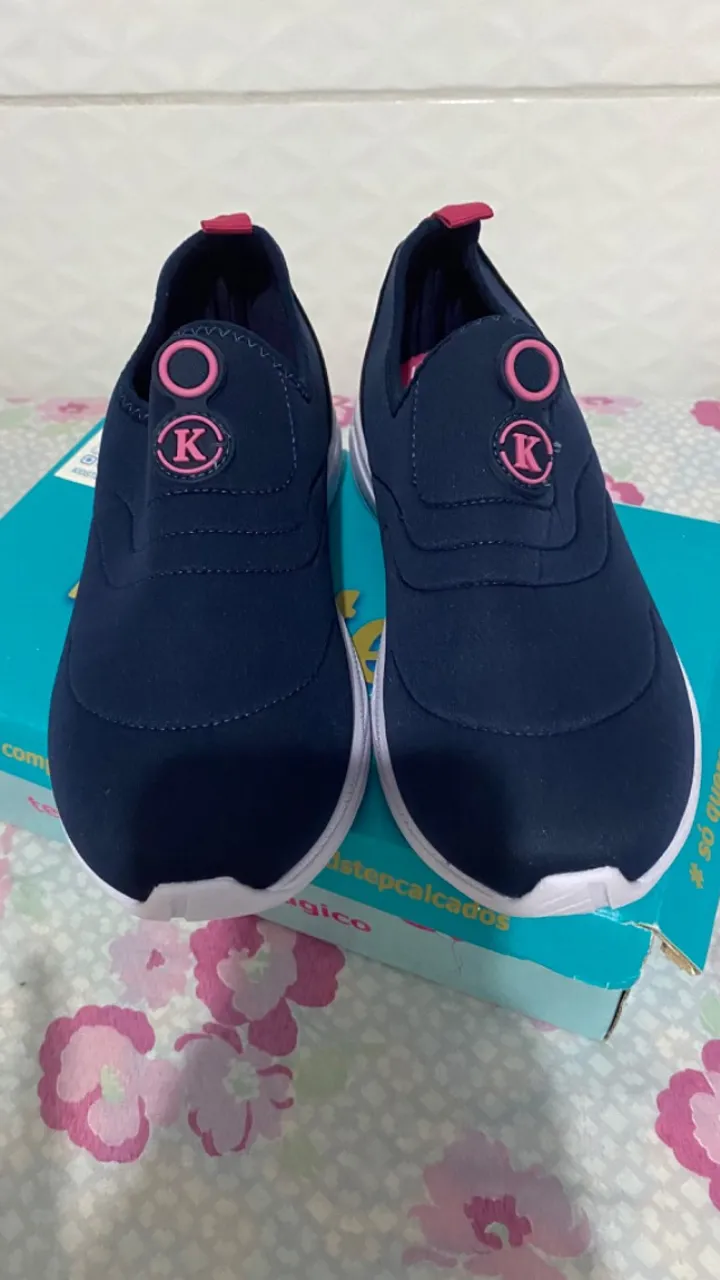 Tênis super confortável, nunca usado azul marinho com detalhes rosa, o motivo que não deu no pé da minha filha a forma é grande.