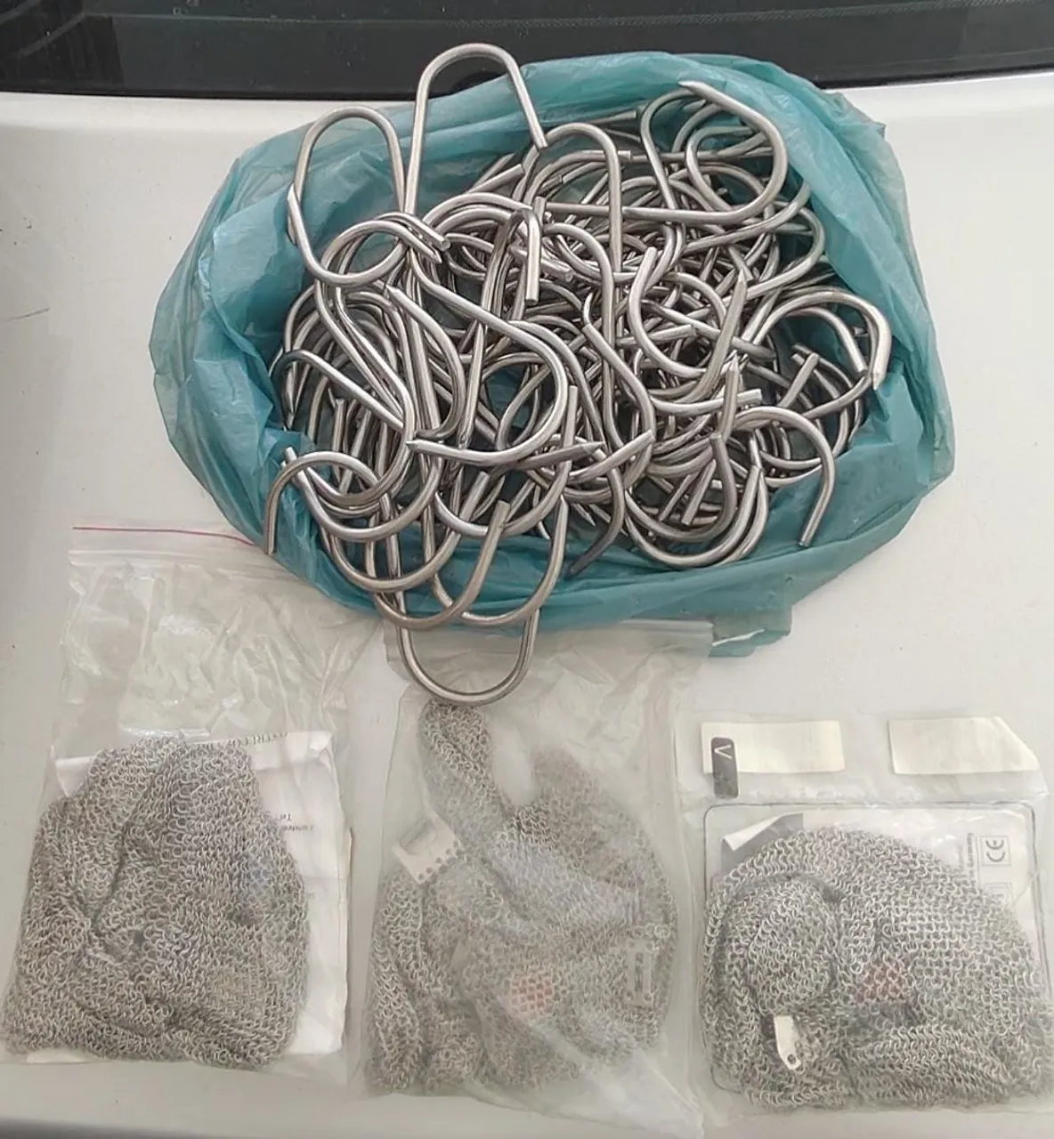 Luva malha de aço novas 03 unidades Tamanhos: 01 - M 02 - G Valor R$ 180,00 unidade Ganchos inox 60 unidades Valor R$ 5,00 unidade