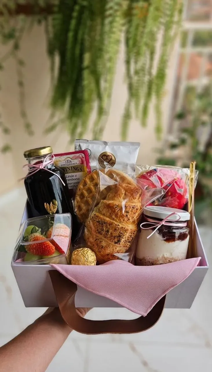 Surpreenda com uma cesta de café da manhã repleta de delícias. Pães, waffles, frutas, iogurte e muito mais!