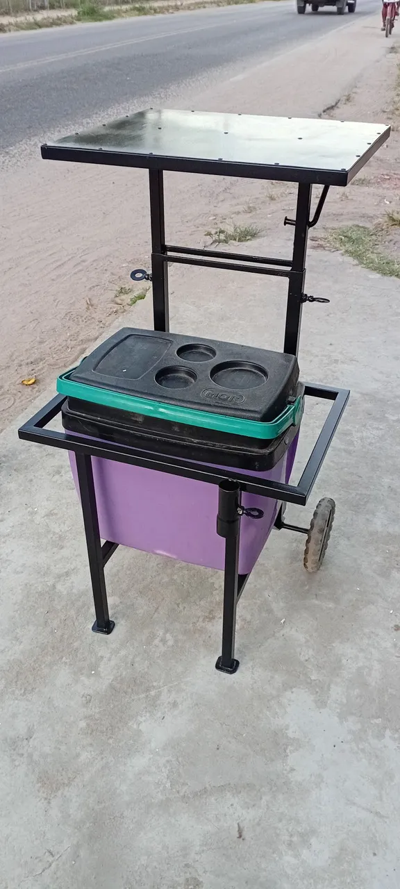 Carrinho para caixa térmica com mesa acoplada, ideal para quem busca praticidade e organização em eventos, praia ou piqueniques. Possui mesa superior para apoio e rodas para facilitar o transporte.