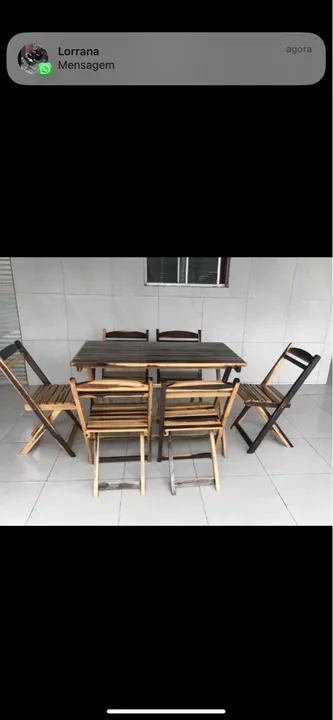 Conjunto de mesa e cadeiras de madeira maciça, ideal para sua área externa. Design rústico e elegante, perfeito para reunir amigos e familiares. Resistente e durável, para longos anos de uso. Aproveite!