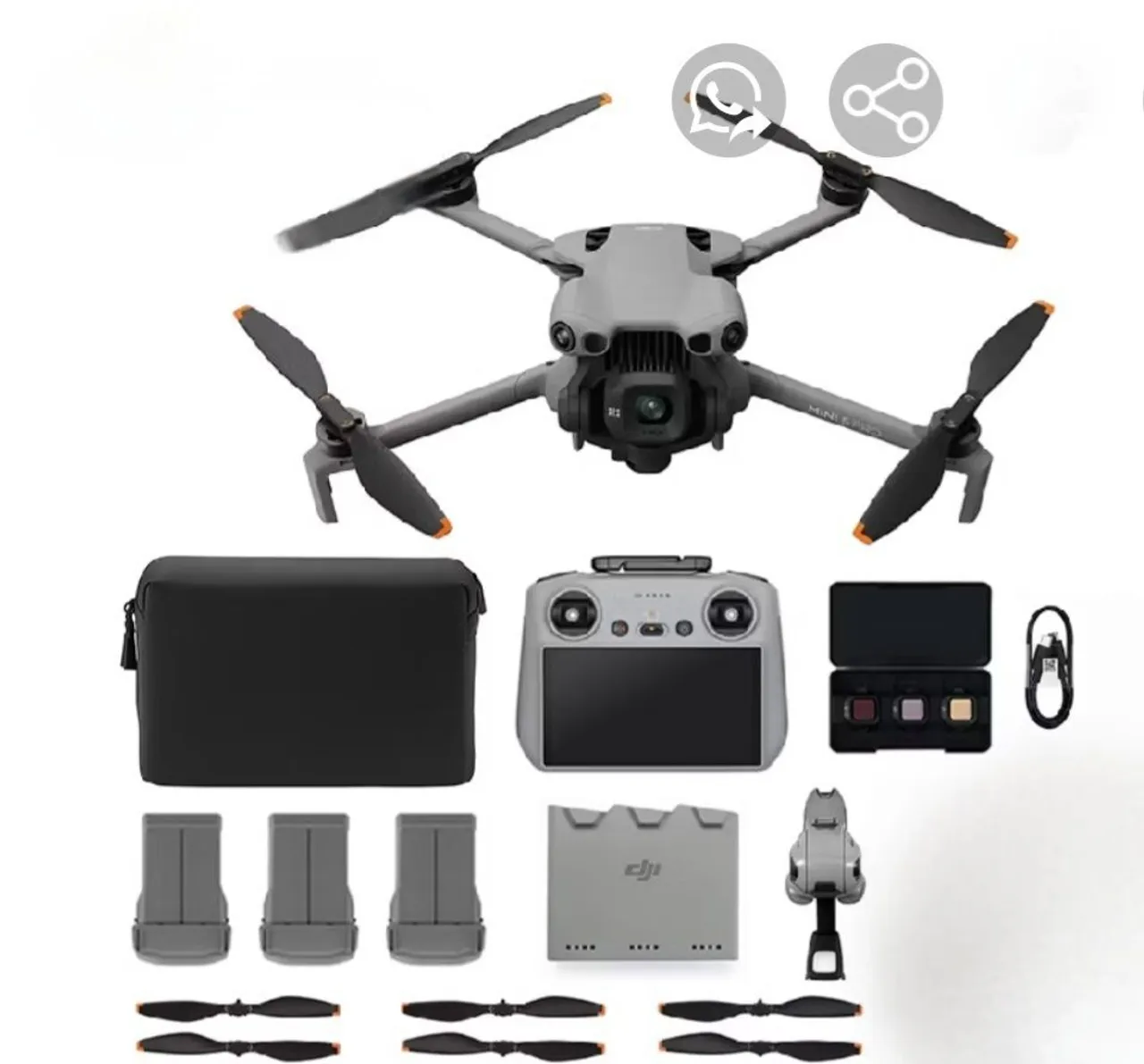 Acompanha drone, controle com tela, hub de carregamento, 3 baterias PLUS com 52 minutos de autonomia em cada bateria, maleta de transporte e lentes ND originais DJI.