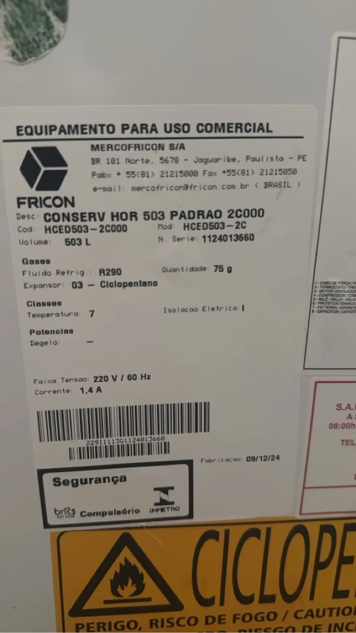 Conservador horizontal Fricon, modelo HCED503-2C000, com capacidade de 503 litros. Ideal para uso comercial, com isolamento elétrico e temperatura de 7 graus. Fabricado em 09/12/24.