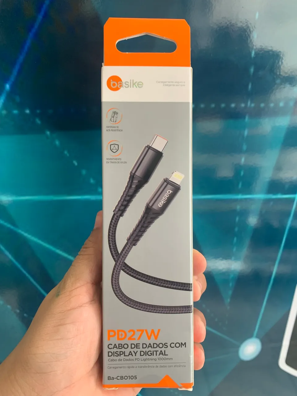 Cabo tipo C para iPhone Basike PD27W com display digital, carregamento rápido e transferência de dados com eficiência. Materiais de alta resistência e revestimento em trama de nylon.