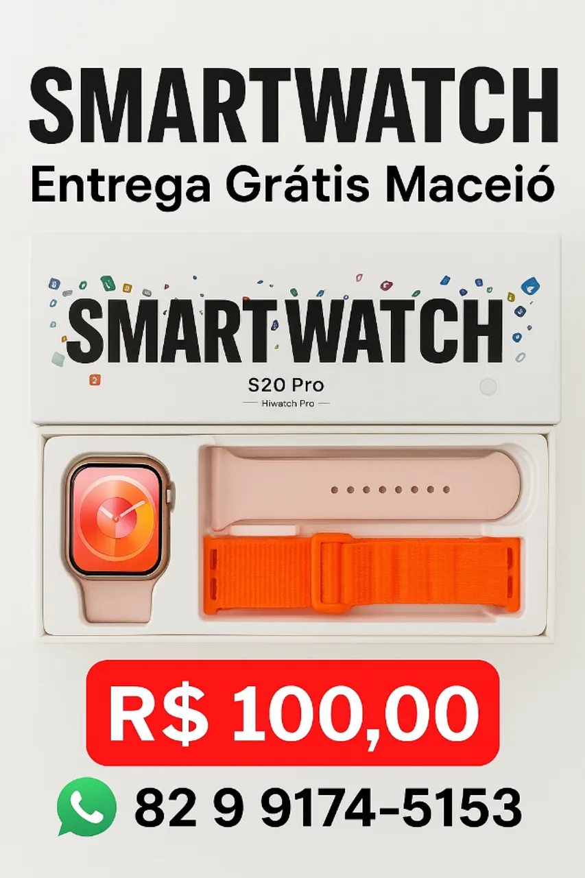 Smartwatch S20 Pro com design elegante e tela vibrante. Acompanha pulseira extra para você personalizar seu estilo. Perfeito para o dia a dia, com entrega grátis em Maceió!