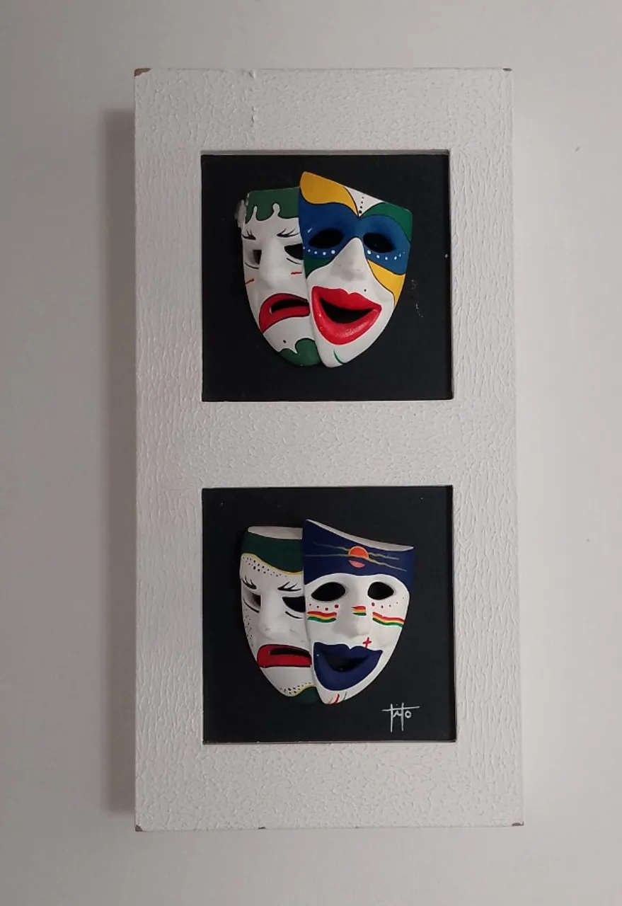 Conjunto de máscaras teatrais coloridas e expressivas, montadas em moldura branca com textura. Ideal para decoração de ambientes, adicionando um toque artístico e cultural.