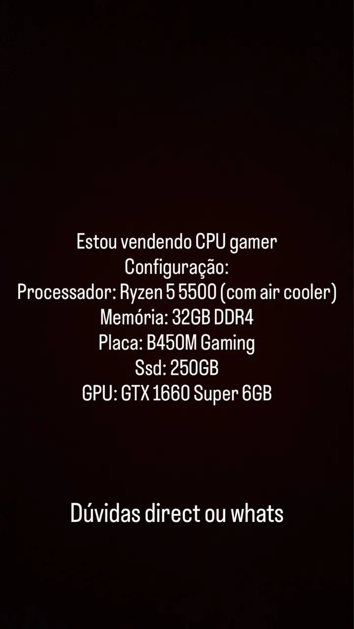 CPU Gamer com processador Ryzen 5 5500, memória de 32GB DDR4 e SSD de 250GB. Desfrute de gráficos incríveis com a GPU GTX 1660 Super 6GB e mergulhe em seus jogos favoritos!