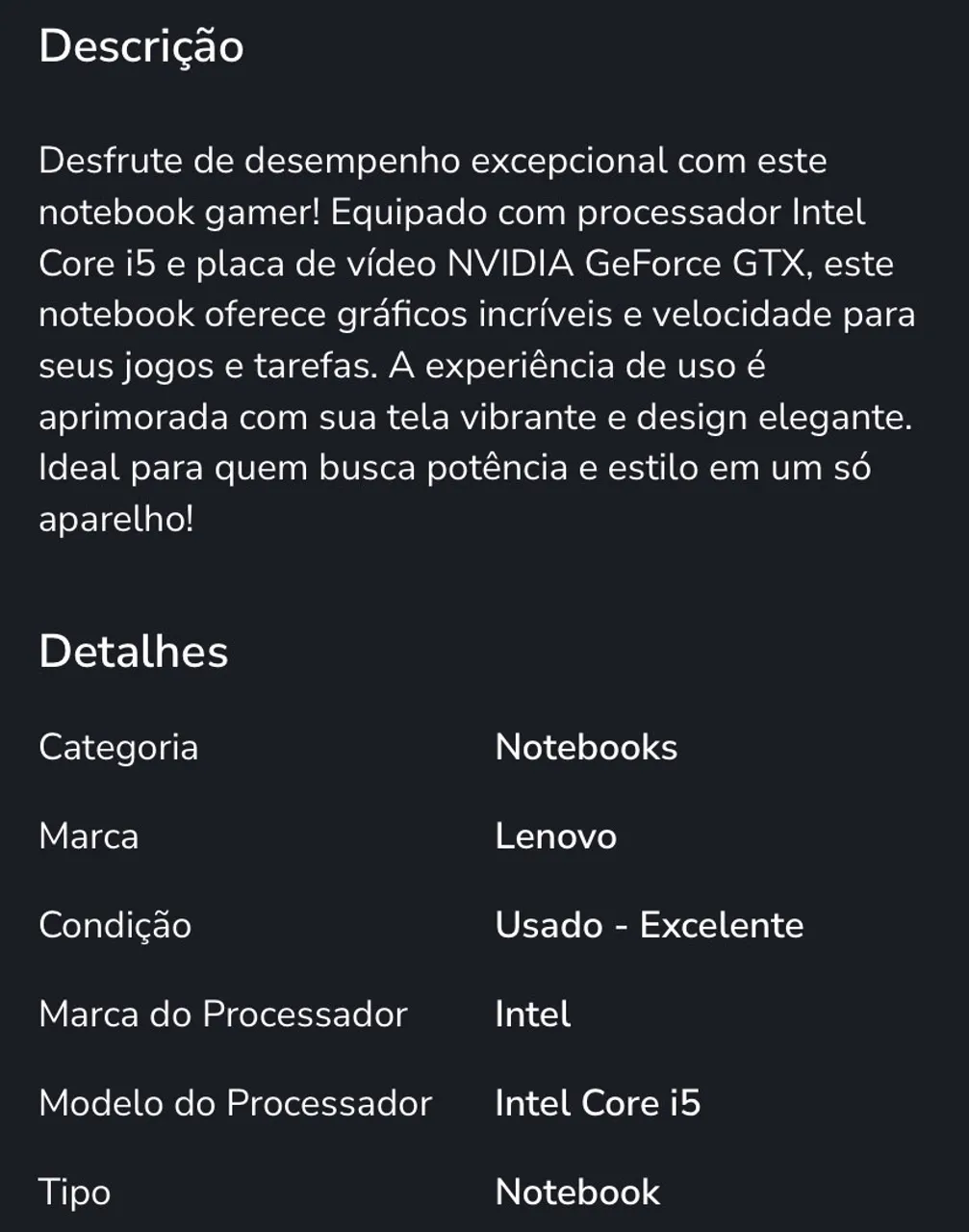 Desfrute de desempenho excepcional com este notebook gamer Lenovo! Equipado com processador Intel Core i5, este notebook oferece gráficos incríveis e velocidade para seus jogos e tarefas. A experiência de uso é aprimorada com sua tela vibrante e design elegante.