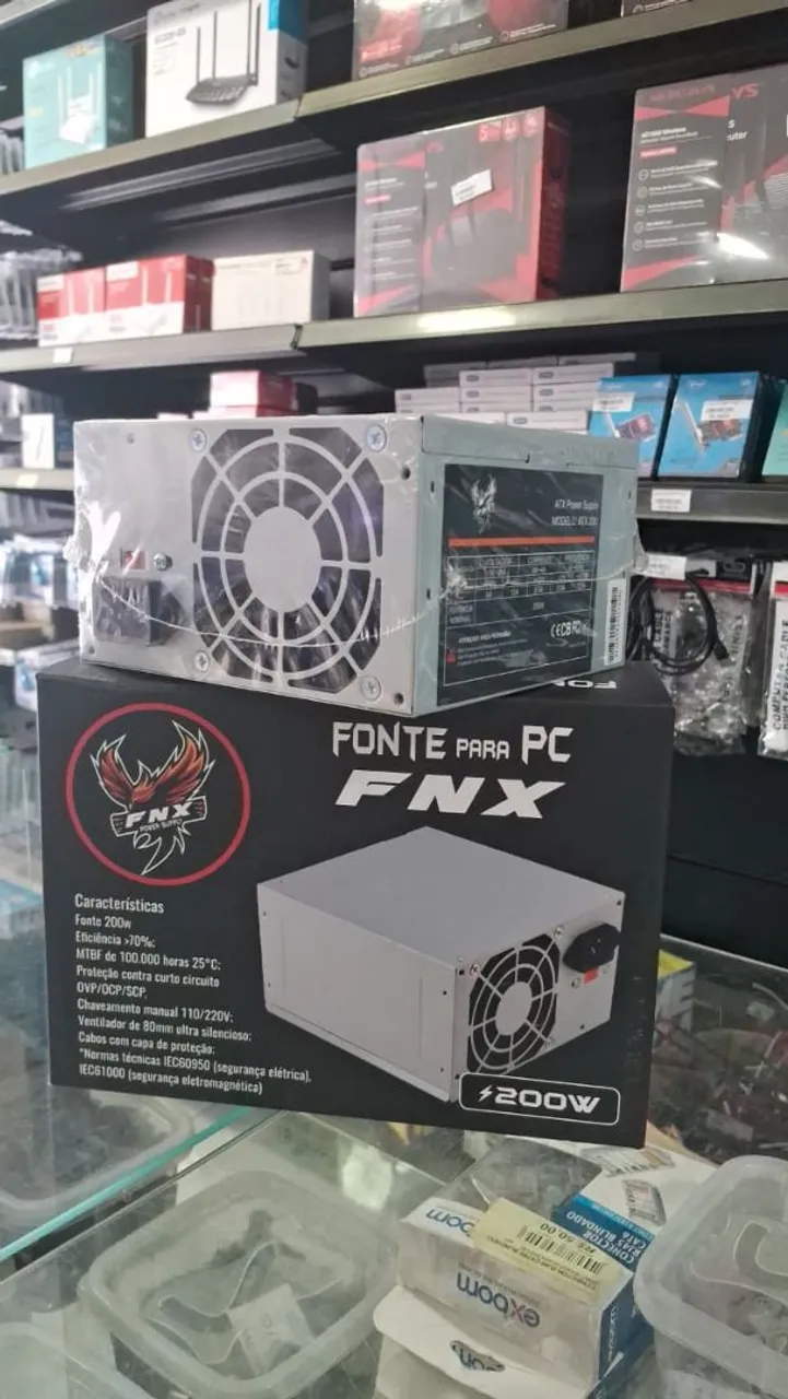 Fonte FNX para PC, 200W, alta eficiência e ventoinha silenciosa. Proteção contra curto-circuito e chaveamento manual.