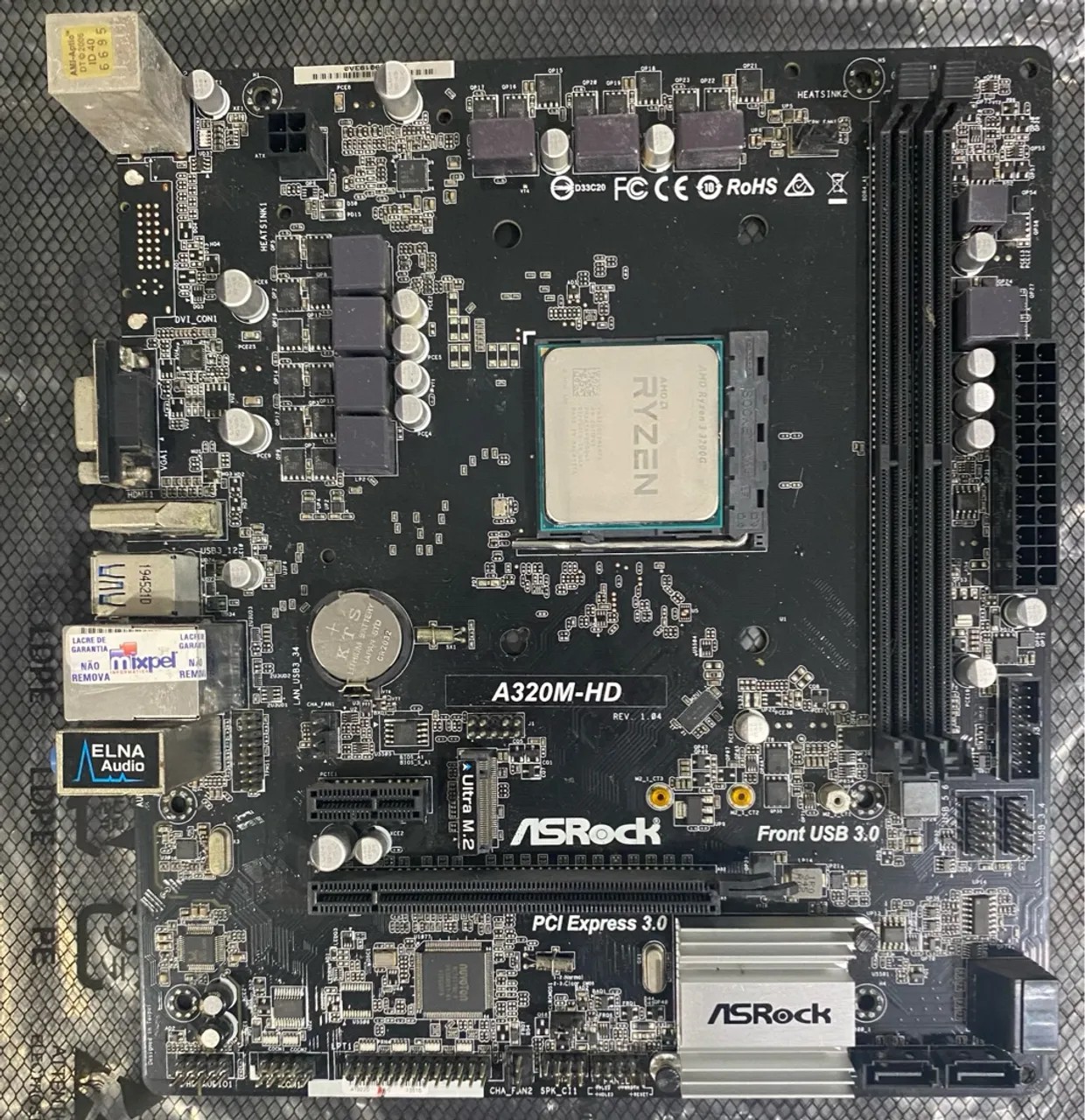Placa-mãe ASRock A320M-HD, ideal para processadores AMD Ryzen. Suporte para memória DDR4 e slot Ultra M.2 para SSDs de alta velocidade. Conectividade USB 3.0 e PCI Express 3.0, Acompanha processador Ryzen 3 3200G com 4 núcleos, gráficos Vega 8 integrados e frequência de até 4.0GHz - ideal para tarefas diárias e jogos leves, sem precisar de placa de vídeo.
