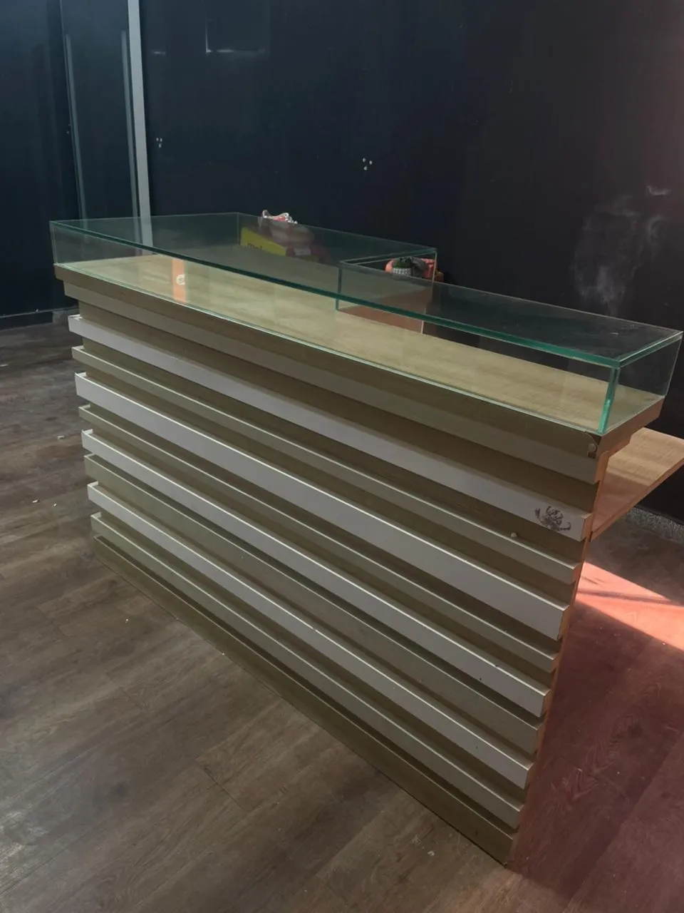 Balcão moderno e elegante, ideal para diversos ambientes comerciais. Design sofisticado e funcional, perfeito para otimizar o espaço e valorizar o seu negócio. Um toque de requinte para o seu estabelecimento!