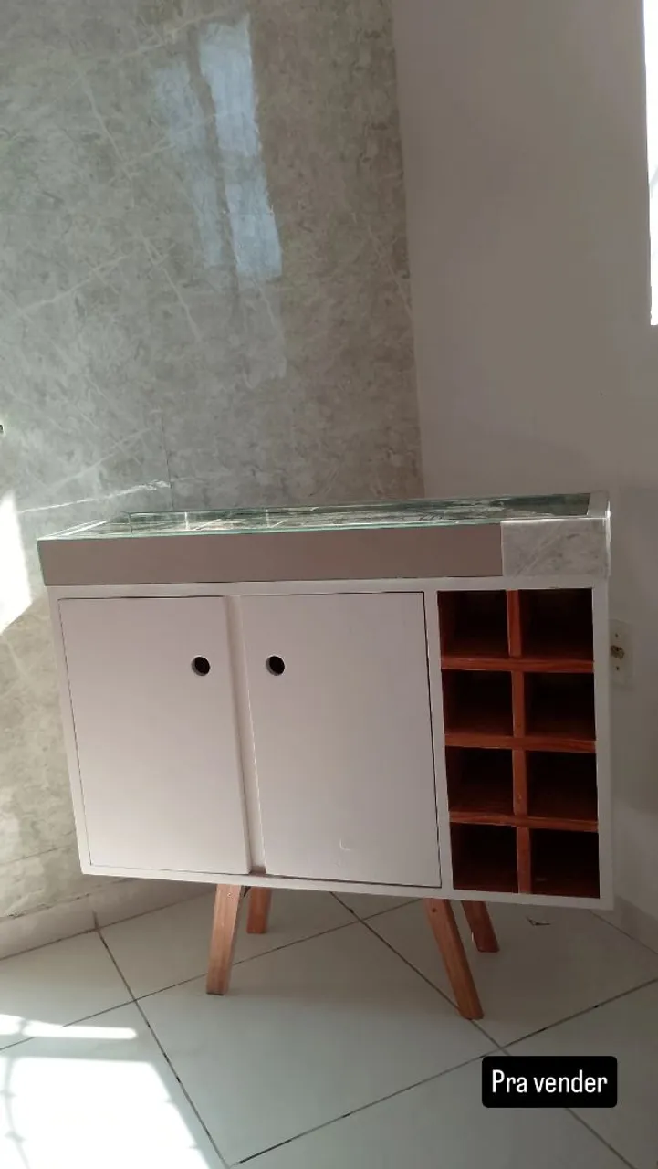 Barzinho charmoso e funcional para sua casa! Design moderno, perfeito para receber amigos e familiares. Detalhes em madeira e espaço para organizar suas bebidas e taças.