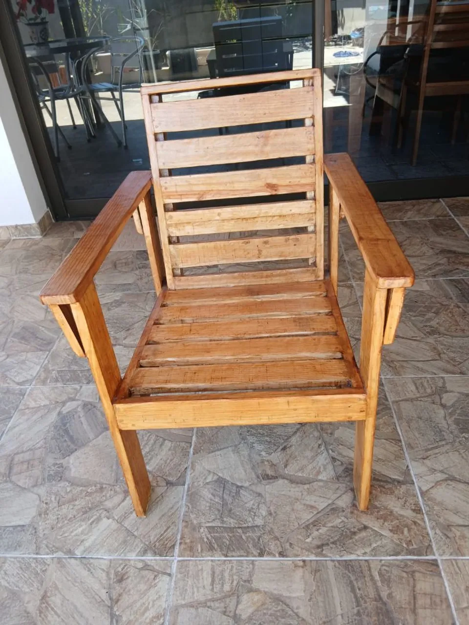 Cadeira de pinho com design rústico, perfeita para quem busca conforto e estilo natural. Ideal para relaxar em sua varanda ou área de lazer.