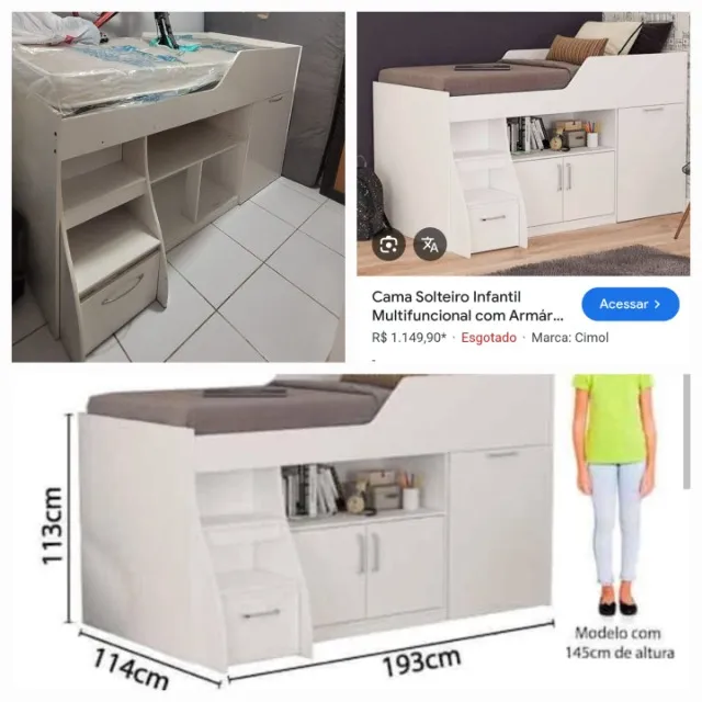 Cama solteiro infantil multifuncional com design moderno e elegante. Possui armário, prateleiras, mesa e escada, otimizando o espaço do quarto. Perfeita para um ambiente prático e confortável.