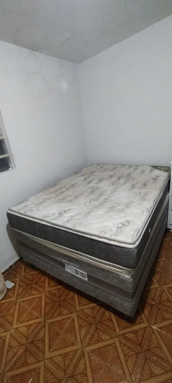 É uma cama casal box e um colchão ortopédico com molas ensacadas
