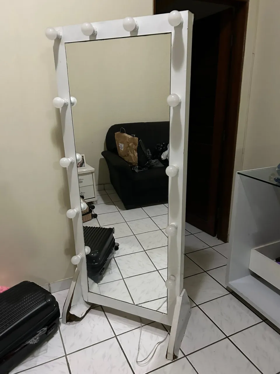 Espelho camarim perfeito para maquiagem e produção, com iluminação que valoriza seus detalhes! Design elegante e funcional.