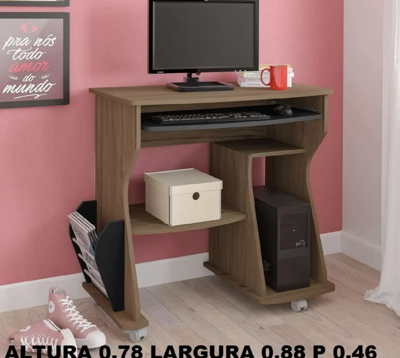 Mesa de Computador em ótimo estado, com estrutura resistente e design moderno para organizar seus objetos e prateleira para acomodar o seu CPU. Perfeita para quem busca praticidade e organização no home office!