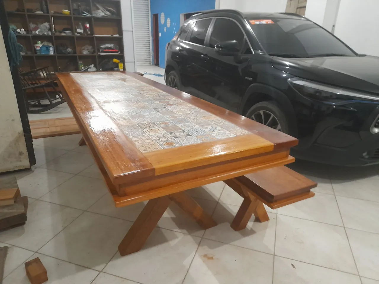 Linda mesa de jantar rústica, feita com madeira de alta qualidade e detalhes em azulejo que dão um toque especial ao ambiente. Perfeita para reunir a família e amigos!