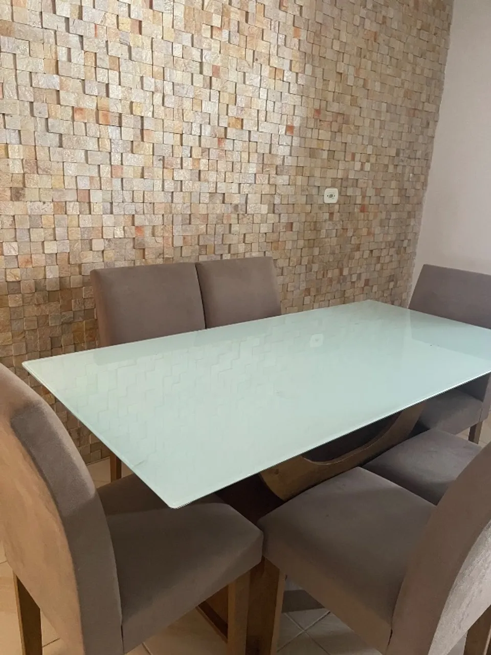 Mesa de jantar com tampo de vidro, o vidro é temperado e transparente, ela está plotada com adesivo branco.