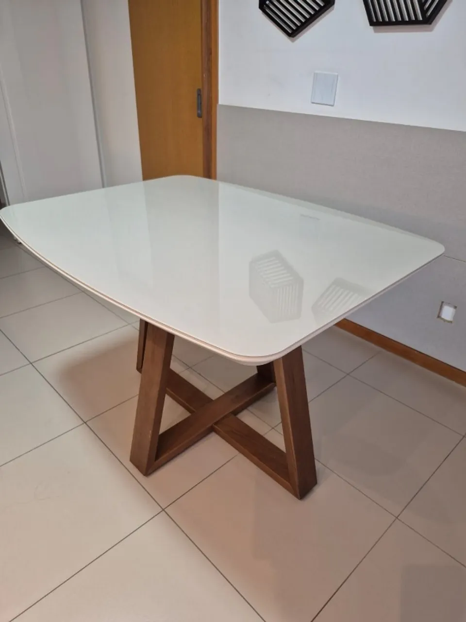 Linda mesa de jantar para 4 pessoas, design moderno e elegante. Perfeita para reunir a família e amigos em momentos especiais. Tampo branco de vidro e base em madeira, combinando beleza e durabilidade. Medidas: 1,15m X 0,90.
