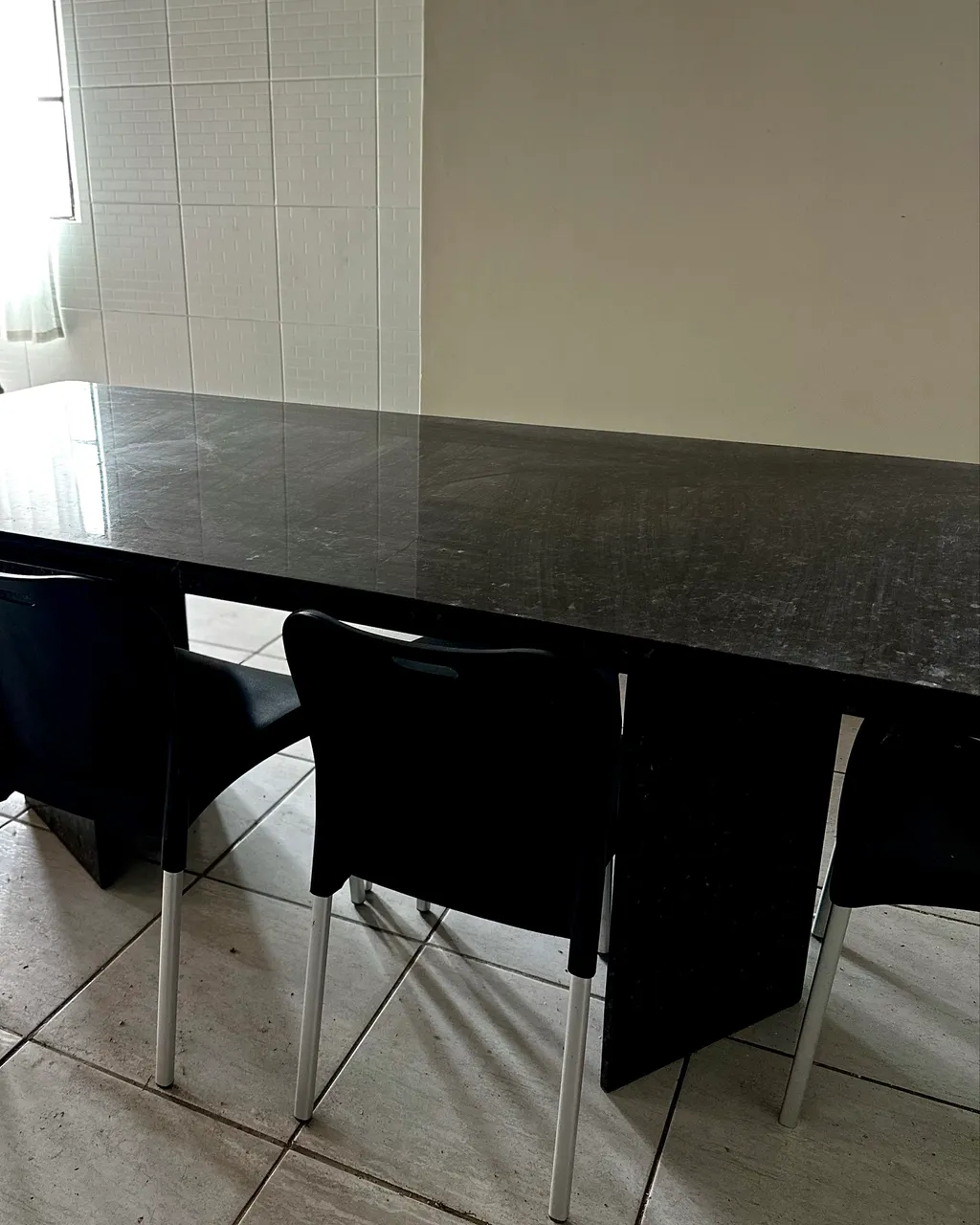 Possui tampo retangular em granito polido e base central no mesmo material, garantindo firmeza e durabilidade. Ideal para cozinha ou sala de jantar.