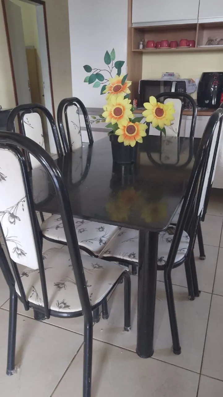Linda mesa de jantar com design moderno e elegante. Perfeita para reunir a família e amigos em momentos especiais. Seu tampo escuro e os detalhes em preto trazem um toque de sofisticação para sua casa.