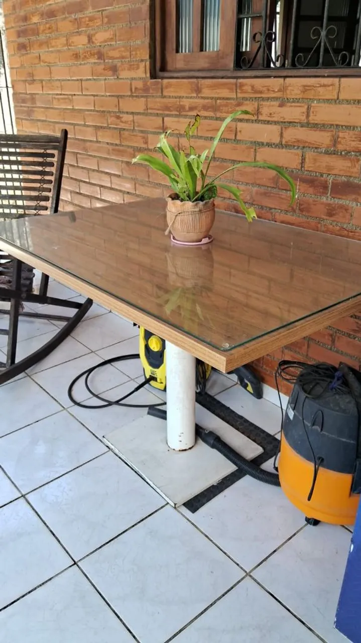 Linda mesa de jantar com design moderno, tampo de vidro e base amadeirada. Ideal para sua sala ou varanda. Perfeita para refeições e encontros.