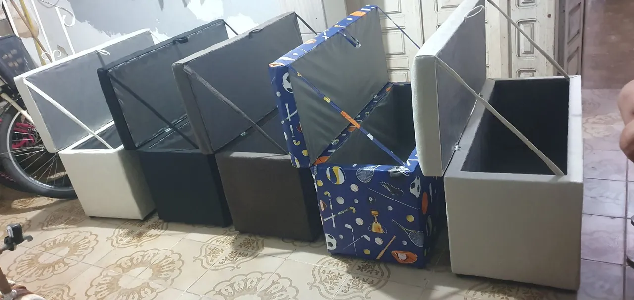 Puffs baú com design moderno e funcional, perfeitos para otimizar seu espaço. Ideais para guardar objetos e decorar sua casa. Entre em contato pelo WhatsApp (82)... ver número para mais informações e preços de fábrica!