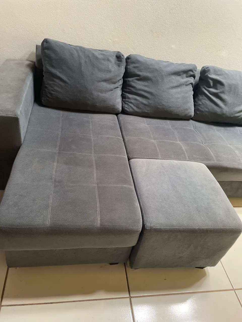 Sofá em formato de L, estrutura toda em madeira, acompanha 3 almofadas e um puf, em ótimas condições para uso