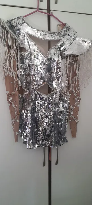 Abale no carnaval com essa fantasia, todo em sequência prata, com detalhes em franjas. Vai com a saia de miçangas .Perfeito para ocasiões especiais! É um macaquinho, veste 40