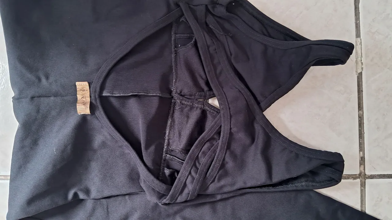 Macacão preto moderno, com design diferenciado nas costas, tecido confortável. Perfeito para malhação..