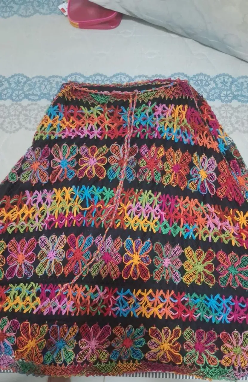 Linda saia de filé com detalhes florais coloridos, perfeita para um visual alegre e cheio de estilo. Feita com materiais de alta qualidade e acabamento impecável, ideal para diversas ocasiões.