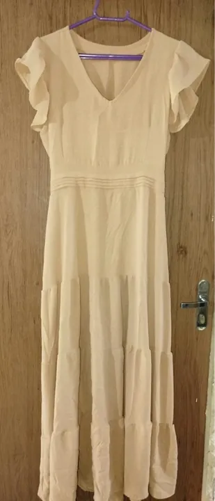Vestido longo bege no tecido crepe, não amassa. Tamanho G.
