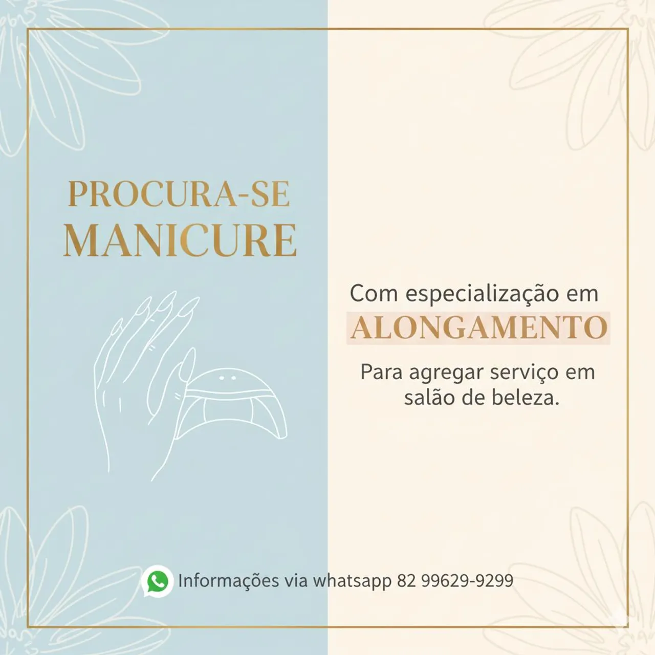 Procuro iniciante em manicure com especialização em alongamento e plástica dos pés para agregar serviço em salão de beleza. Mais informações chama no ZAP