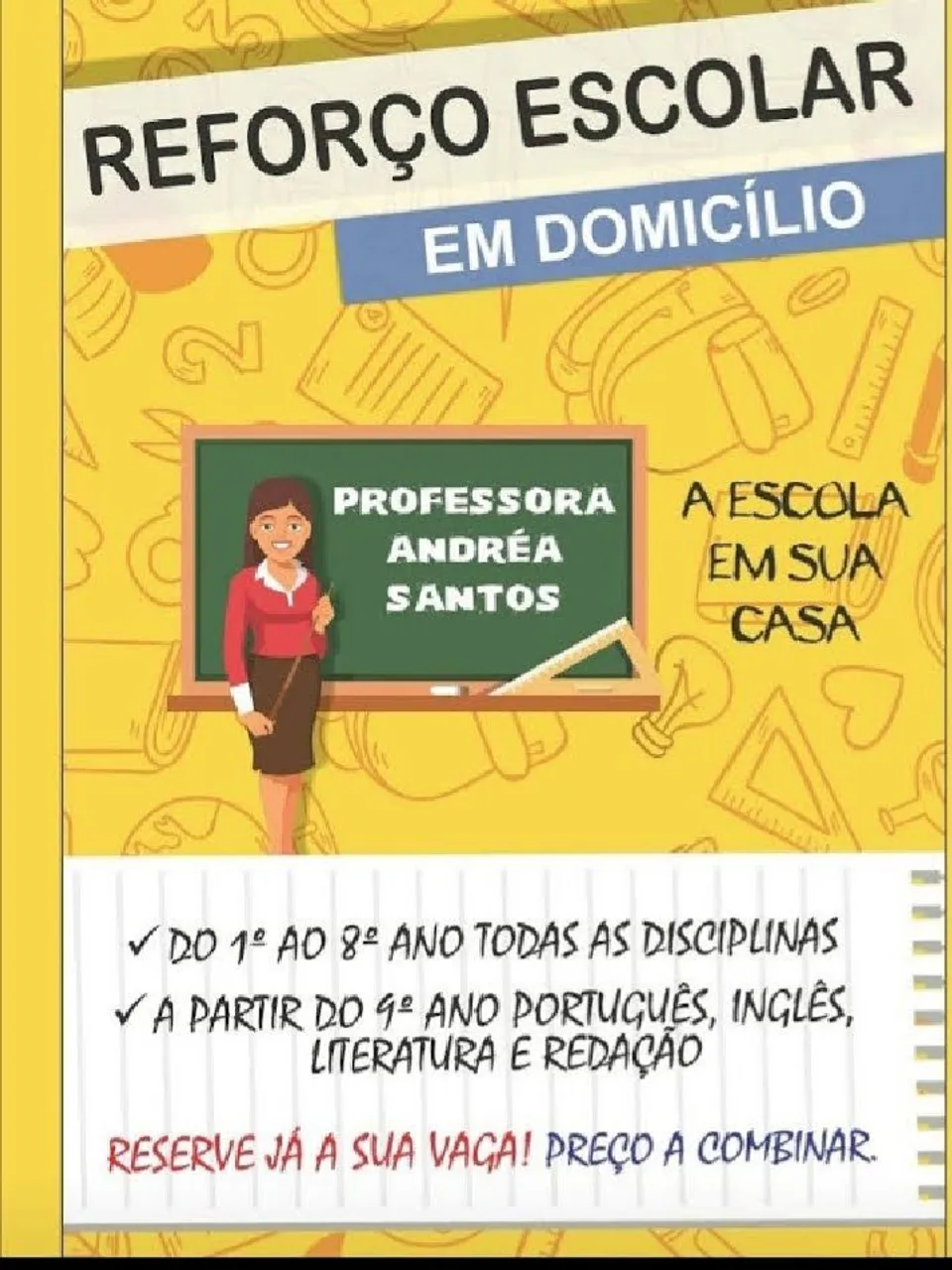 Há 20 anos trabalhando com reforço escolar. Graduação em letras português-inglês na Ufal e pós-graduada em língua portuguesa, literatura e inglês. Cursando pós em neuropsicopedagogia. Ligue já:
