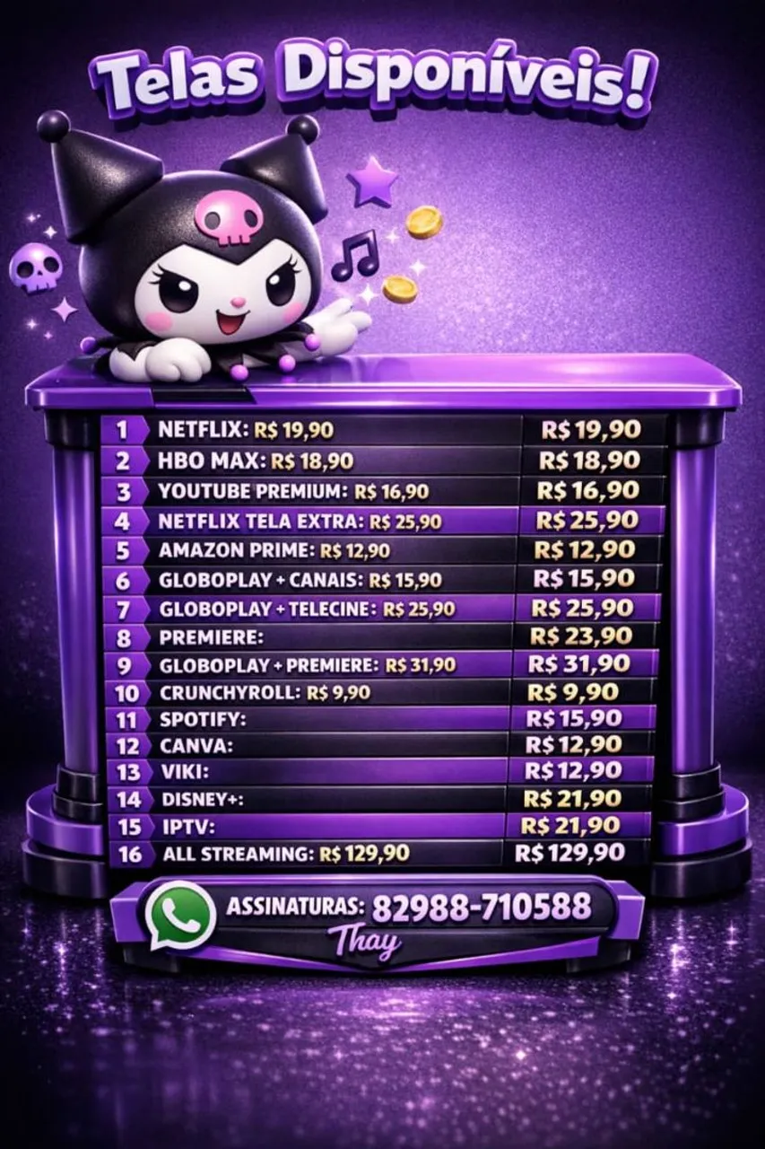 Tenha acesso a uma variedade de plataformas de streaming com assinaturas flexíveis e preços incríveis! Assista seus filmes, séries e programas favoritos. Tenho referências ?